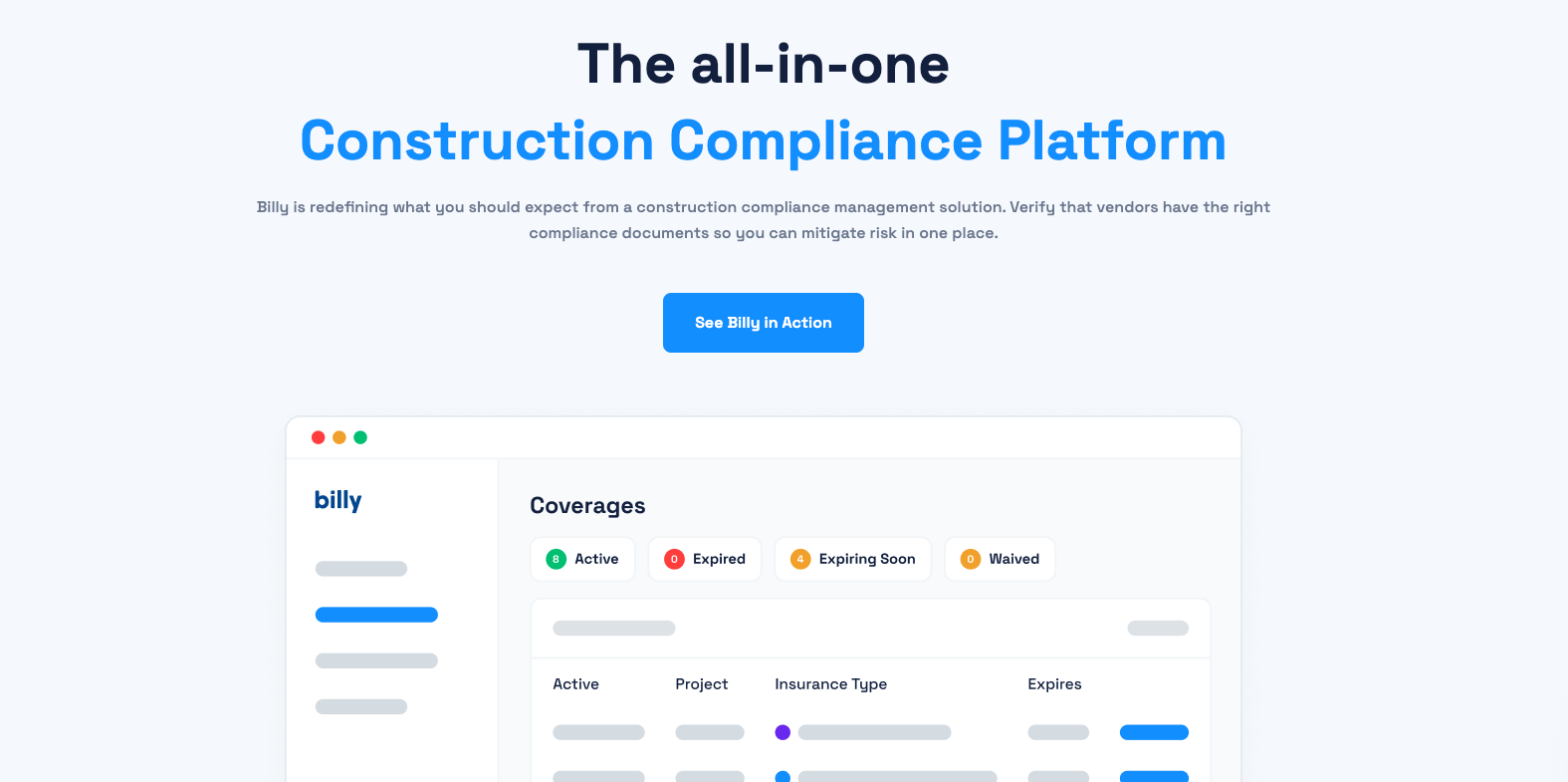 Billy serves consustrction companies, landlords, property managers, residential portfolio managers, and commercial property owners with workflows designed specifically for construction, tenant and Vendor insurance tracking.