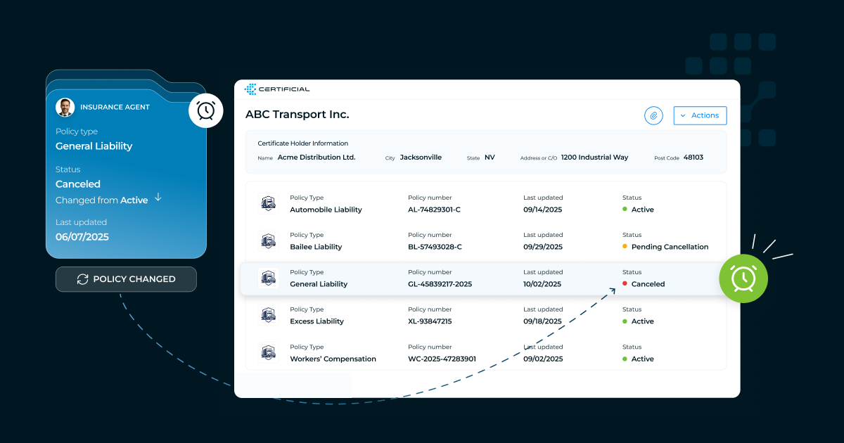 Smart COIs connect directly to insurance agency management systems, monitoring live policy data in real time rather than relying on static documents. Coverage changes (such as cancellations, limit reductions, and endorsements), are reflected within seconds of being recorded in the insurance Agent's system.